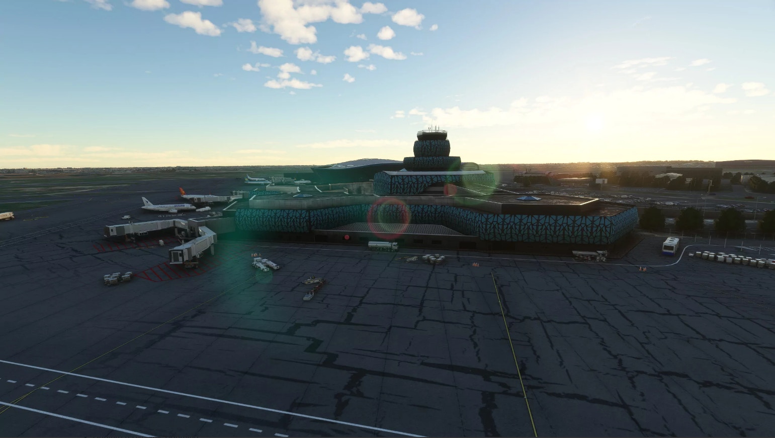 The developer’s notes say that the scenery features “photoreal” scenery of the airport, performance (FPS) friendly, optimised dynamic lighting and realistic custom models for the tower, terminal, ARFF and more.