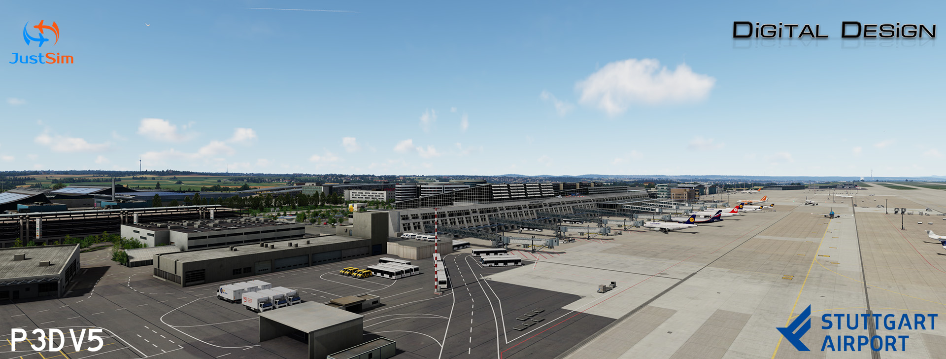 JustSim’s Stuttgart Airport for Prepar3D v5 is available from SimMarket for €19,-, but owners of the previous version can get it for an upgrade price of €5.
