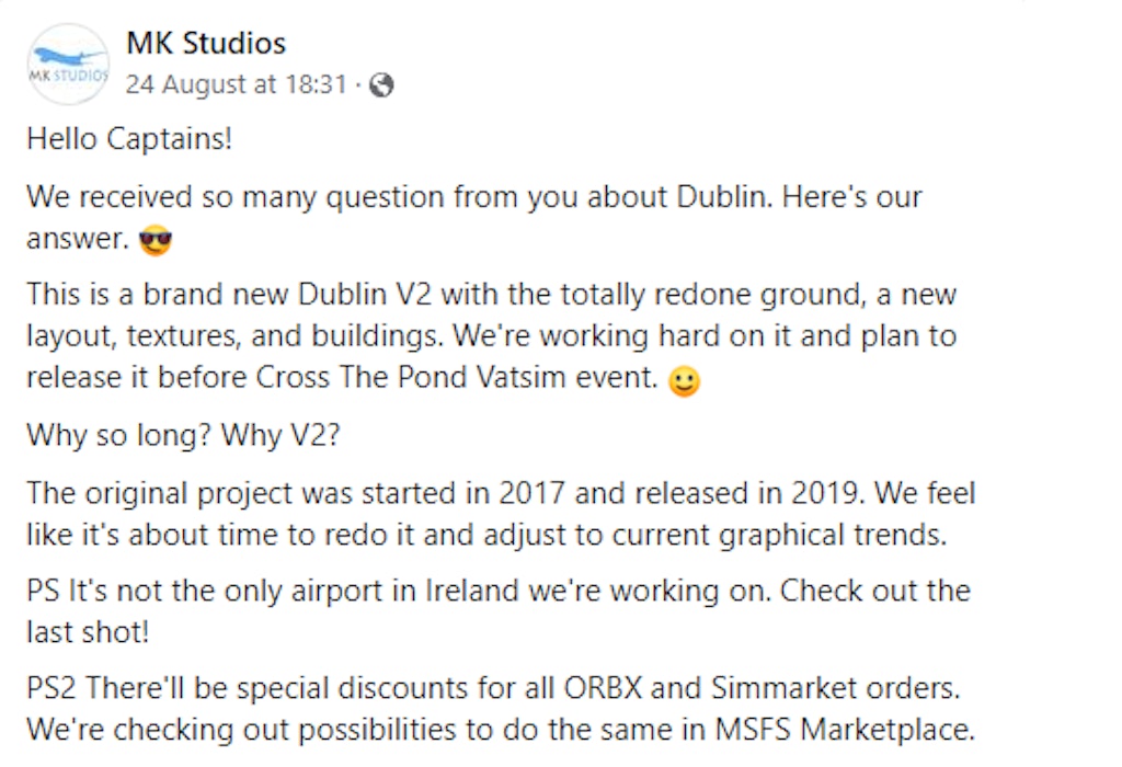 With the brand new runway 10L/28R recently opening at Ireland’s Dublin Airport, developer MK Studios has taken to Facebook to keep simmers in the loop with the new runway’s arrival into the sim.