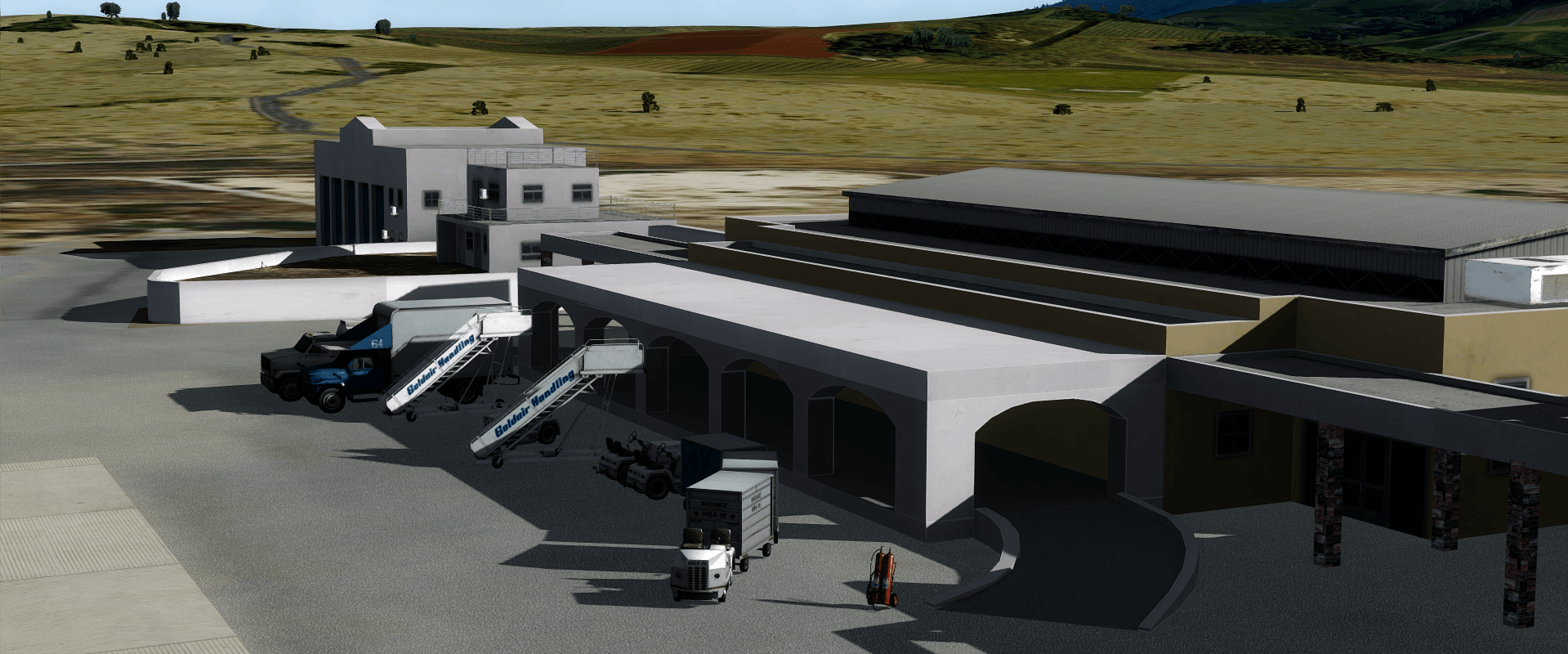 The previews show the addition of runway and PAPI lights, grass, blast fences and a lot of apron vehicles, such as stairs, service trucks and baggage carts. The previews also show off the ATC tower of the airport, situated alongside the taxiway to the runway.