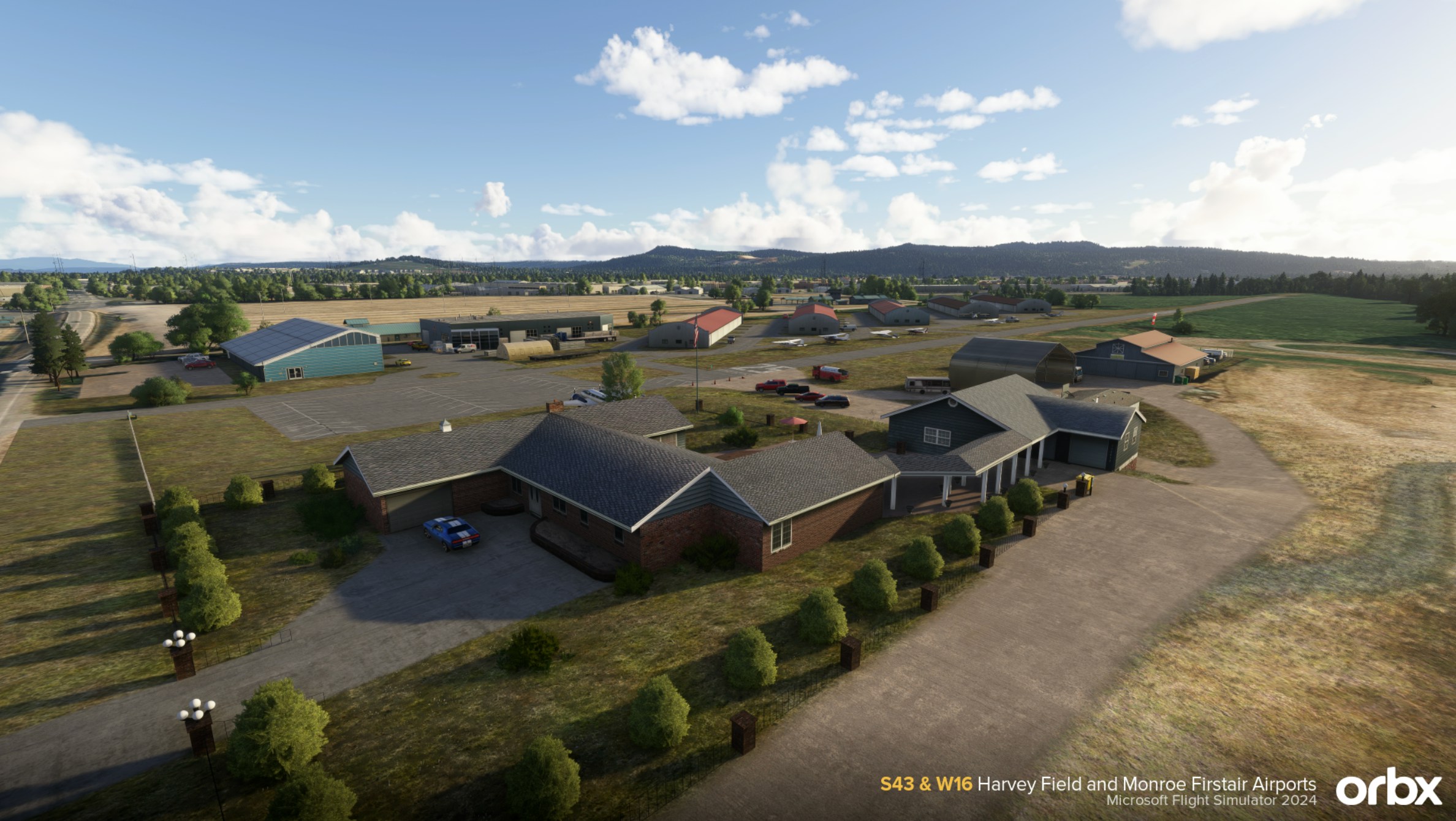 S43 Harvey Field and W16 Monroe Firstair are two small airports located in the Pacific Northwest Region of the United States. In collaboration with Orbx, developer Andreas Hegi re-imagined these two fields with MSFS 2024 features in mind.