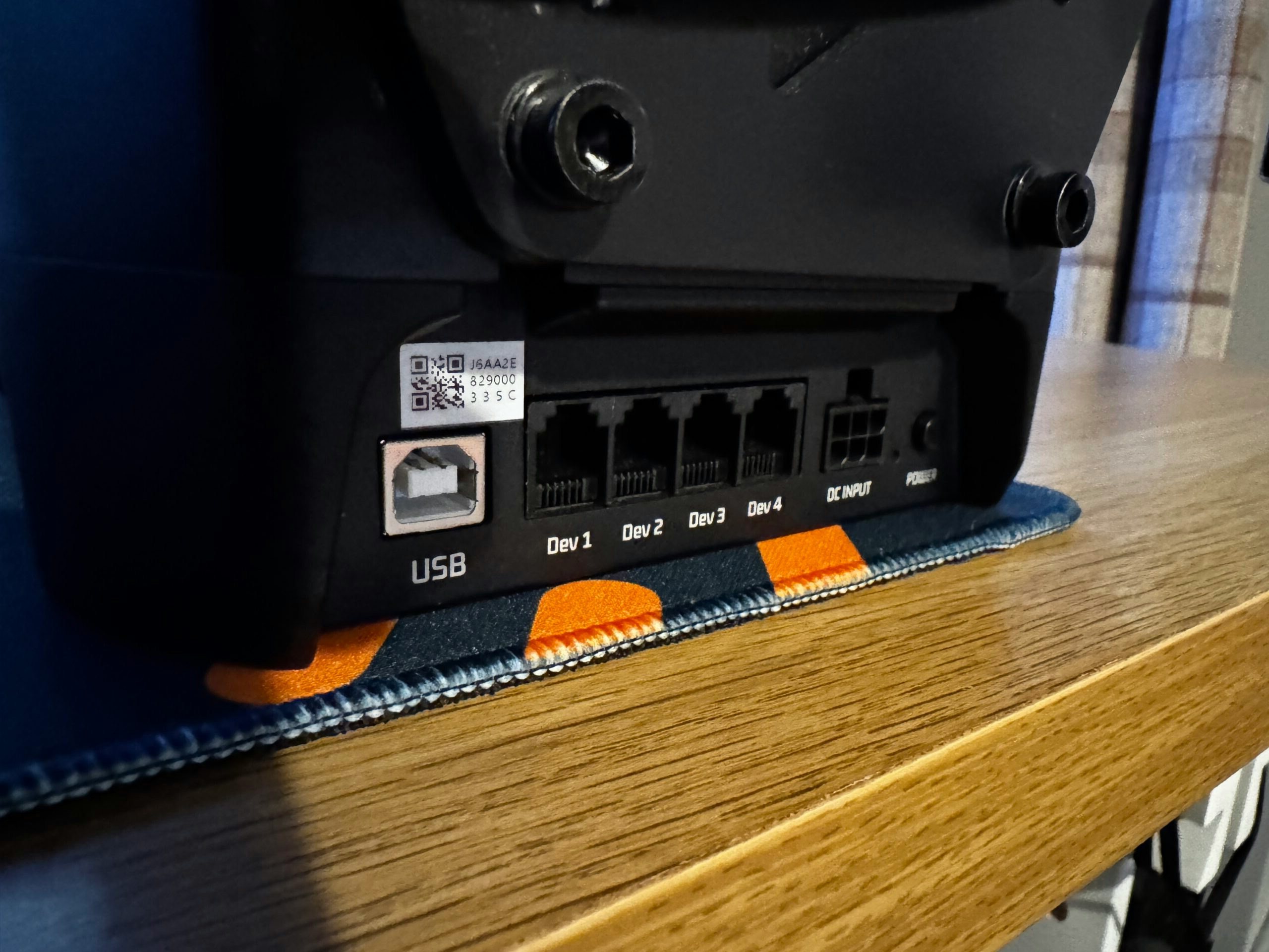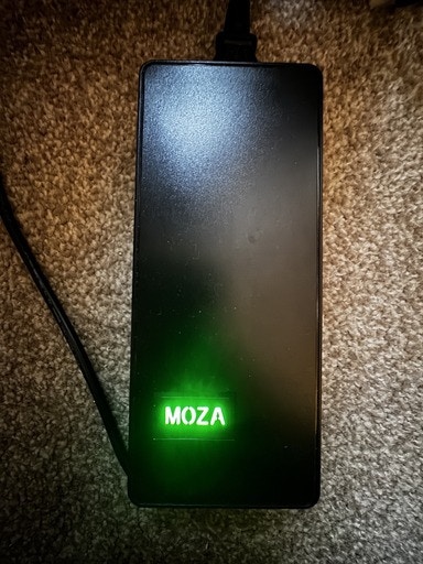 The AB9 Base uses a six-pin power cable with a large transformer. Once plugged in, a backlight in the shape of the MOZA logo illuminates — a handy touch, especially when navigating the tangle of cables beneath a desk. A push button next to the power port powers the unit, triggering a full initial movement check where the stick centres itself once complete. The base connects to the PC via a USB-A to USB-B cable — the kind often used with printers.