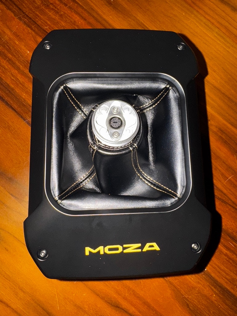 Upon arrival at my doorstep, I was greeted with three large and heavy boxes, smartly designed and well packaged. The largest — and by far the heaviest — was the AB9 Base, which, when opened, was shrouded in a quality branded black dust cover. Lifting the roughly five-kilogram (11 lbs for our American friends) base out of the dust cover, it was clear that MOZA had opted for high-quality materials. The AB9 is built to be robust, with a black ‘aviation grade aluminium’ casing protecting the mechanical internals, a stitched leather dust cover reminiscent of a luxury car’s gear selector, and brushed steel fixings for stick mounting. The branding is tastefully applied, with a few MOZA decals giving it a refined, understated look — albeit on the larger side.