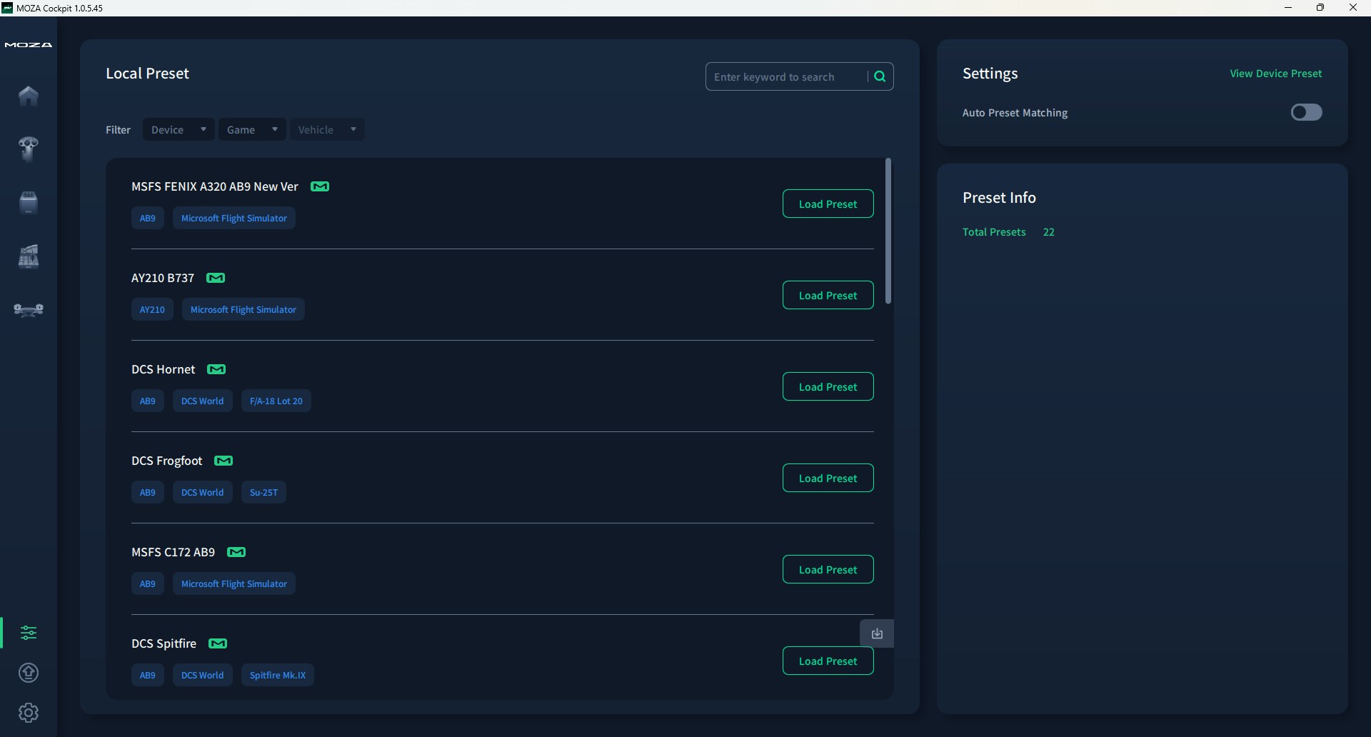 These predefined profiles can be loaded manually or triggered using the auto preset matching function, which automatically switches to the correct profile when you load a supported aircraft. While this feature is incredibly useful, it won’t work for aircraft not on the list. In such cases, choosing the closest match — like using the MSFS FENIX A320 profile for the ToLiss A320Neo in X-Plane — is a good workaround.