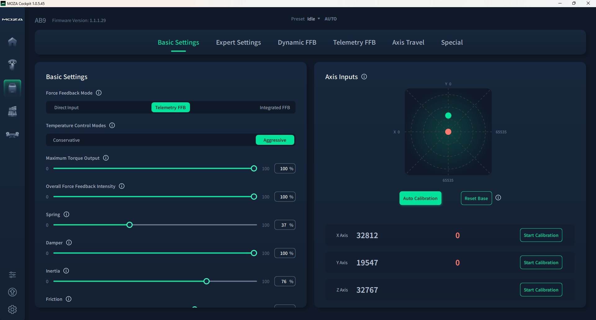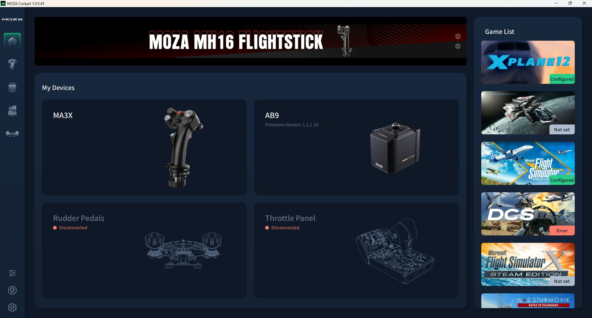 On initial startup, MOZA Cockpit automatically installs and updates any required drivers for connected peripherals. Once complete, calibration is next — a largely automatic process where the stick performs a self-test, running through its full range of motion and sensor checks. This is also the first time you experience the raw power of the AB9 Base in action, as it vibrates and settles into place.