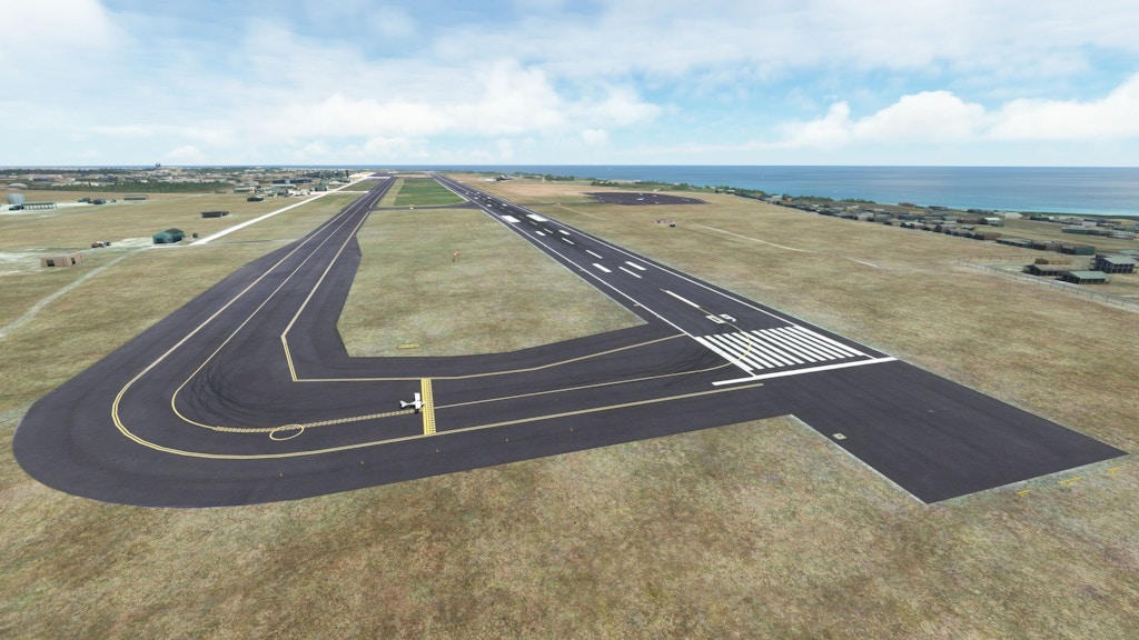 - Airport represented as of 2022, with upgraded taxiways and extended tarmac.