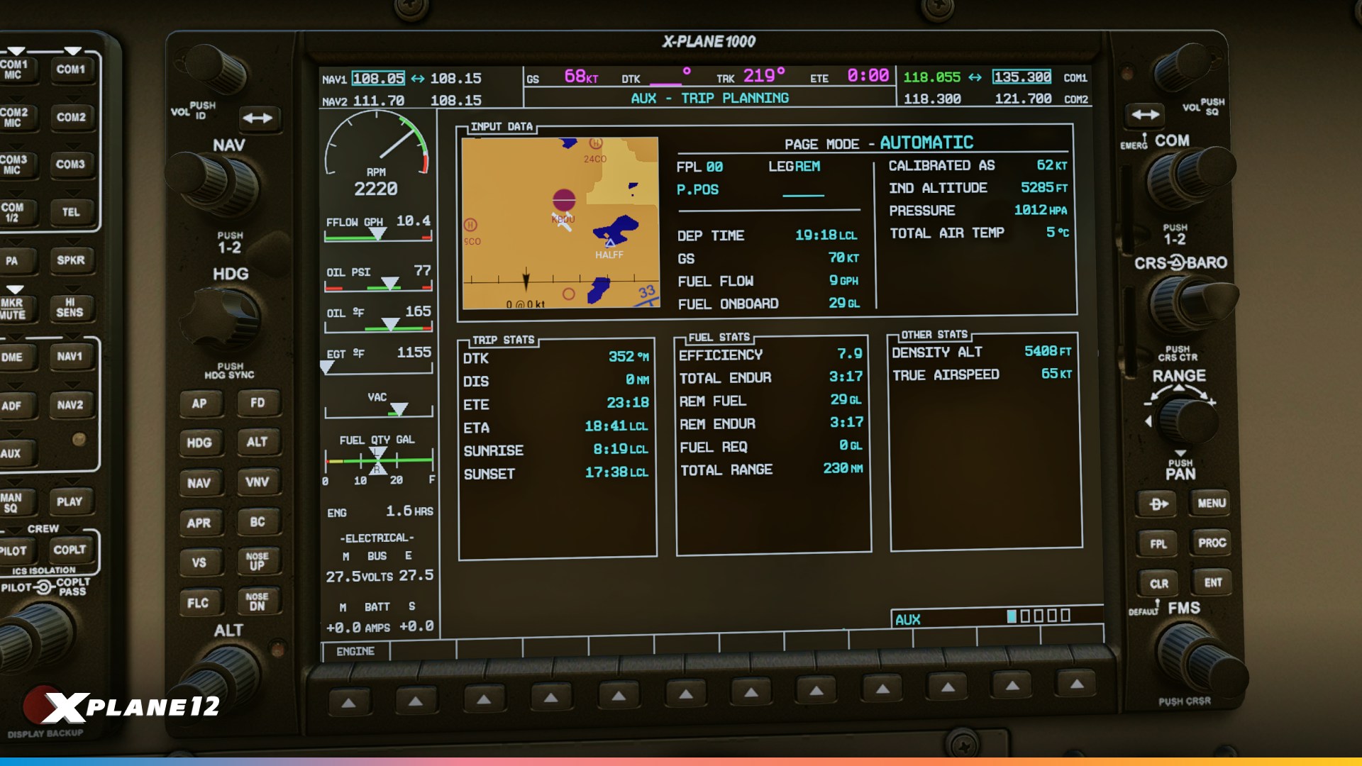 The X1000 received extensive updates in 12.4.0. Several critical issues including synthetic vision airfield drawing errors, terrain display problems, and a crash when drawing runway strips have all been fixed. A vertical profile view has been added, obstacles are now displayed within the coverage range of the FAA digital obstacle file, and the MFD now takes winds into account for ground track and fuel range.