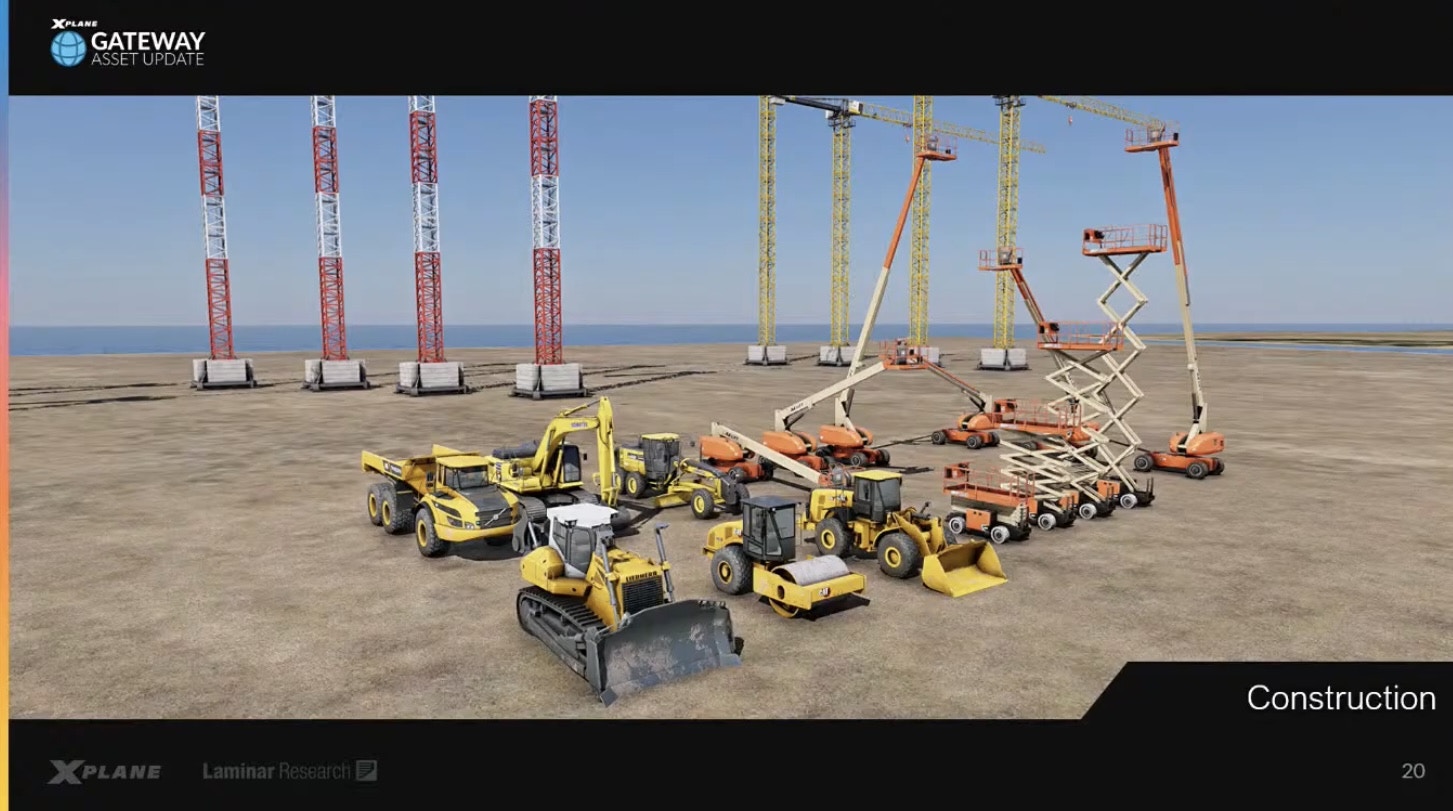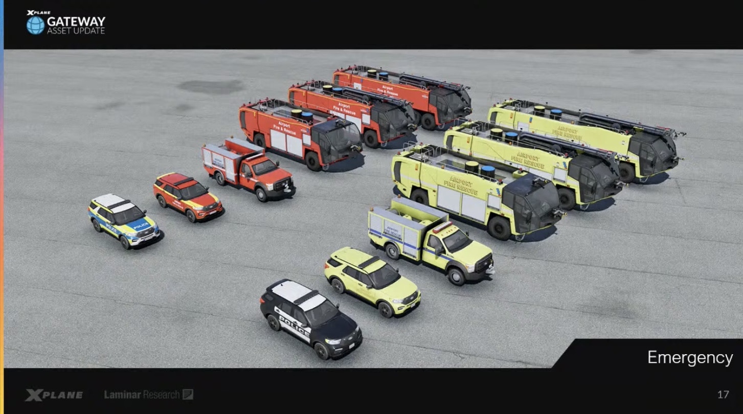 Next up was Alex on the X-Plane team to talk about the Gateway Asset Update. Alex said that the X-Plane team wasn’t always sure what to create for updates to the Gateway, but that following community suggestions the team is now working on a list of items. A comprehensive list was shown on screen, but among the models actually showcased during the 20 minute presentation were airport service vehicles, police cars and fire trucks, construction vehicles, “because who’s airport isn’t always under construction”, and more ramp lighting options. Justin, a.k.a. Mr X is one of the new artists recently hired by Laminar Research to bring some of these models into the sim, an announcement which received some applause in the room.