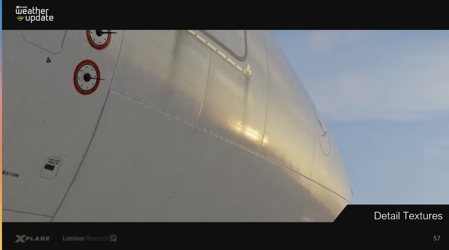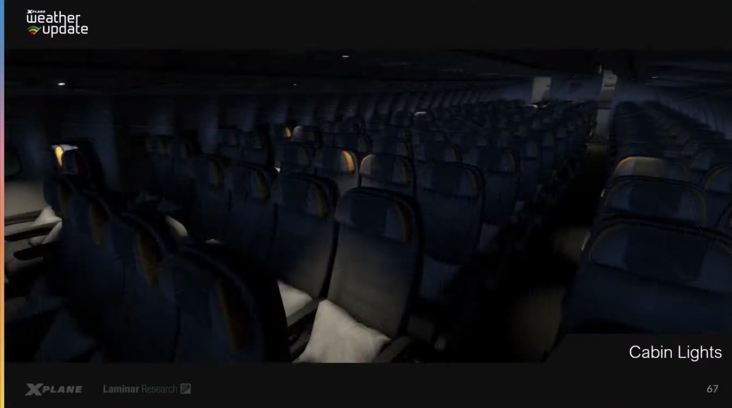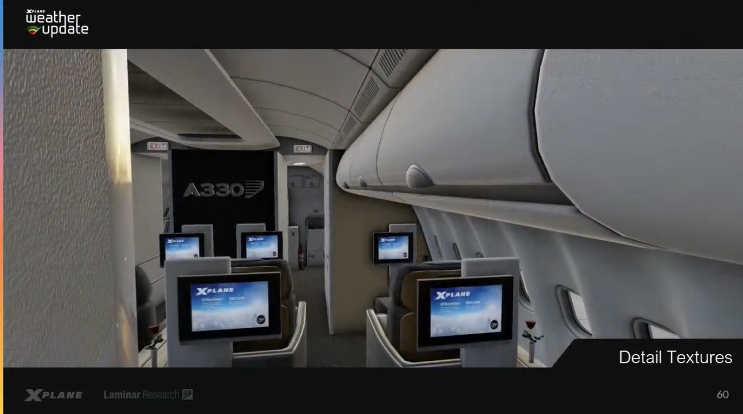 New detail textures are also coming. These use the decal system that was previously used exclusively with X-Plane’s scenery to bring paint effects on fuselages, surface details in the cabin, carpet effects in the cabin, and surface details on the cockpit. Preview images again showed some of these new details and decals.
