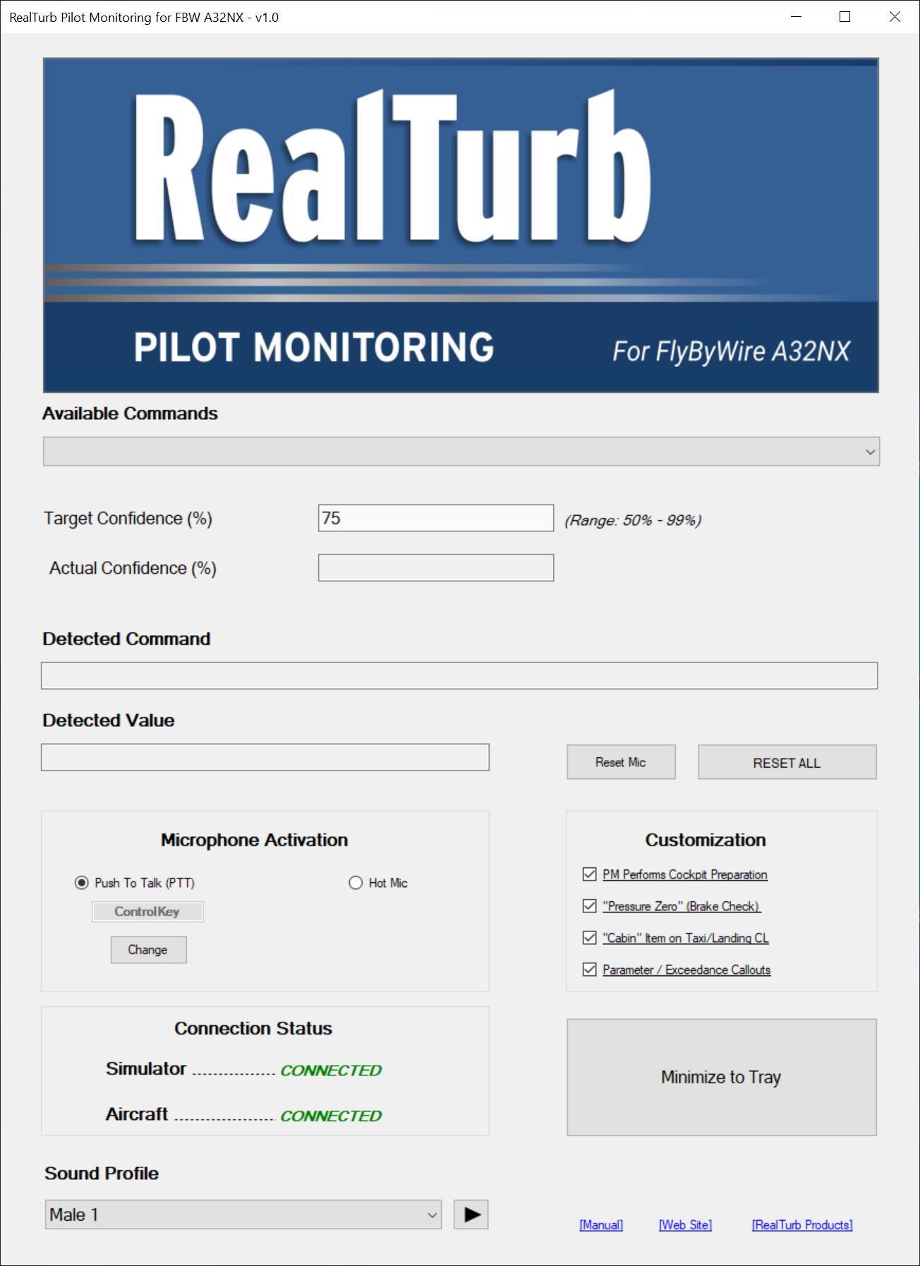 The package ships with an application which connects to the simulator and is able to read the aircraft state, which prompts the PM to make audio callouts to abnormal situations. In addition, the pilot can use voice commands instructing the PM to perform actions (such as operating the flaps, gear, buttons, knobs, switches, and selecting autopilot values), perform flight phase related tasks (setting standard BARO, setting go around config) and read checklists.